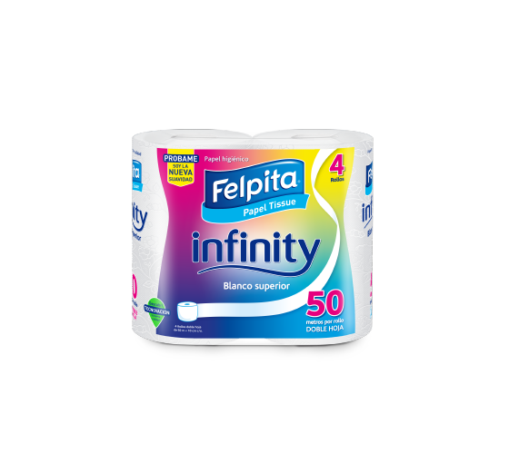 Felpita Infinity se renueva para ofrecerte aun más papel de pura celulosa simple hoja. Los nuevos rollos de Infinity son de 50 metros y como siempre realizados con pura celulosa para que el papel sea aun más blanco, más delicado y más resistente.