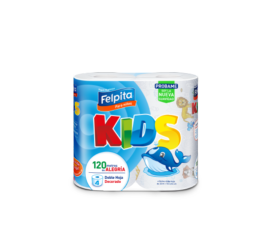 Felpita Kids ha sido renovado con emocionantes historias de animales que acompañan al niño en el aprendizaje. Un papel higiénico producido con el uso exclusivo de las mejores fibras de celulosa virgen que lo vuelven suave, resistente y seguro al contacto con la delicada piel de los niños.