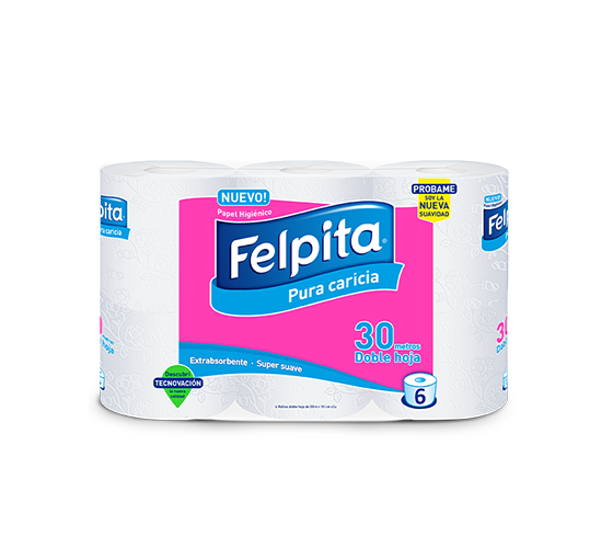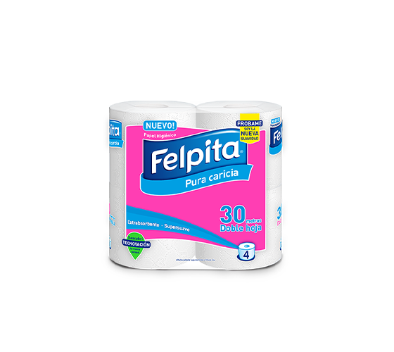 Felpita Pura Caricia es el nuevo papel higiénico de celulosa pura de alta calidad en rollos doble hoja de 30 metros.